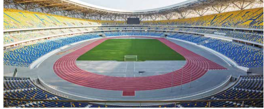 专用高弹性EPDM颗粒喷面,表面颜色柔和, 颗粒状表面,防止刺眼光线的反射,美观耐 用,并可采用多色彩搭配。
