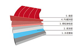 ◆ 复合型塑胶跑道是三层结构,底层同透气型跑道 一样,将橡胶颗粒按照比例与单组份聚氨酯粘合 剂混合均匀,采用摊铺设备制成缓冲弹性层,PU 聚氨酯弹性层铺设厚度2~3mm,面层为耐磨聚氨 酯面漆混合EPDM颗粒喷涂的耐磨层。这种跑道能 够满足一般田径场地的运动要求。