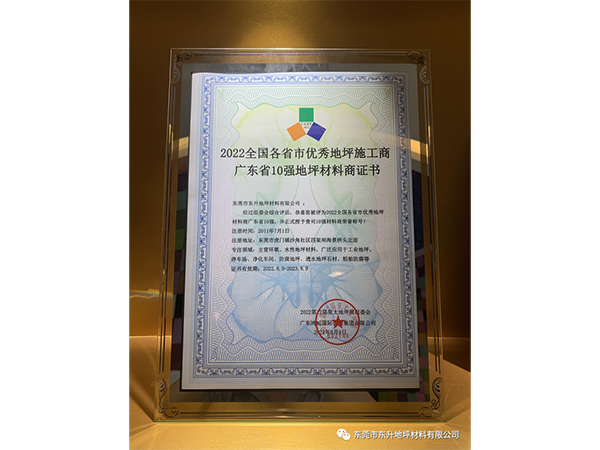 荣获2022全国各省优秀地坪施工商广东省10强地坪材料商证书