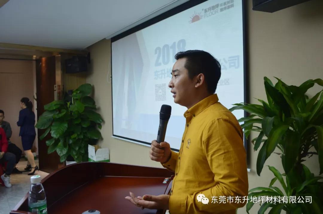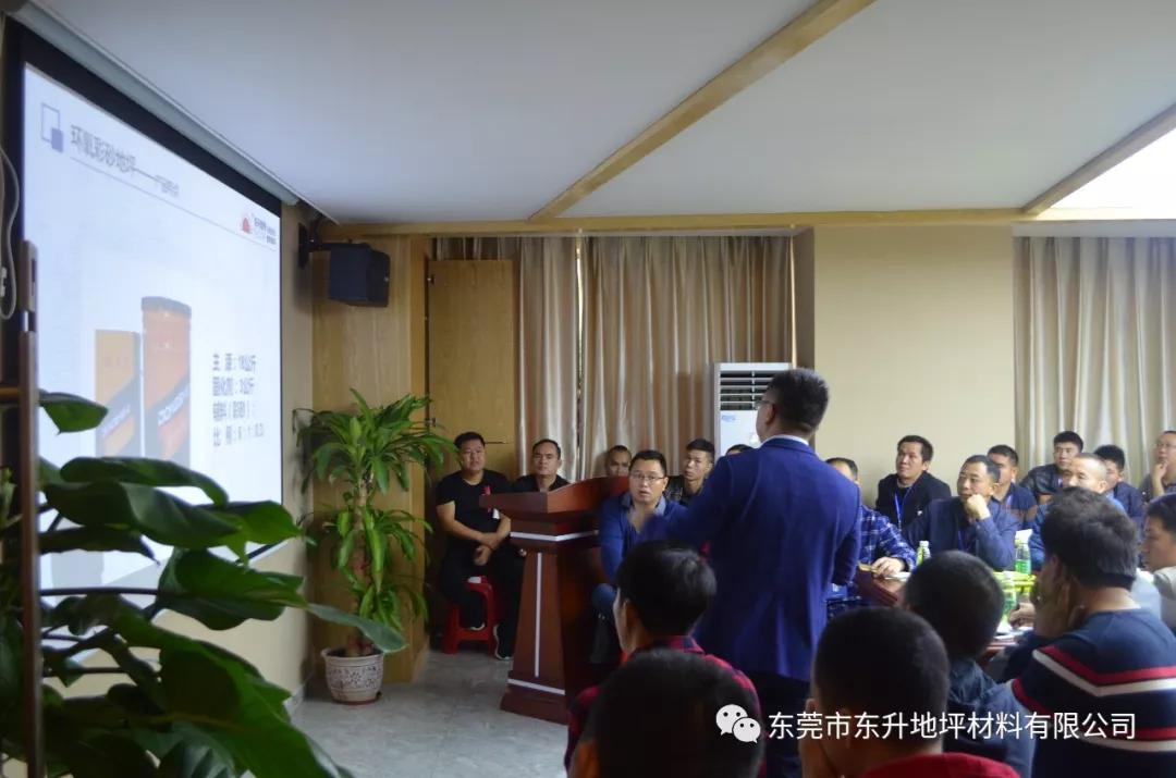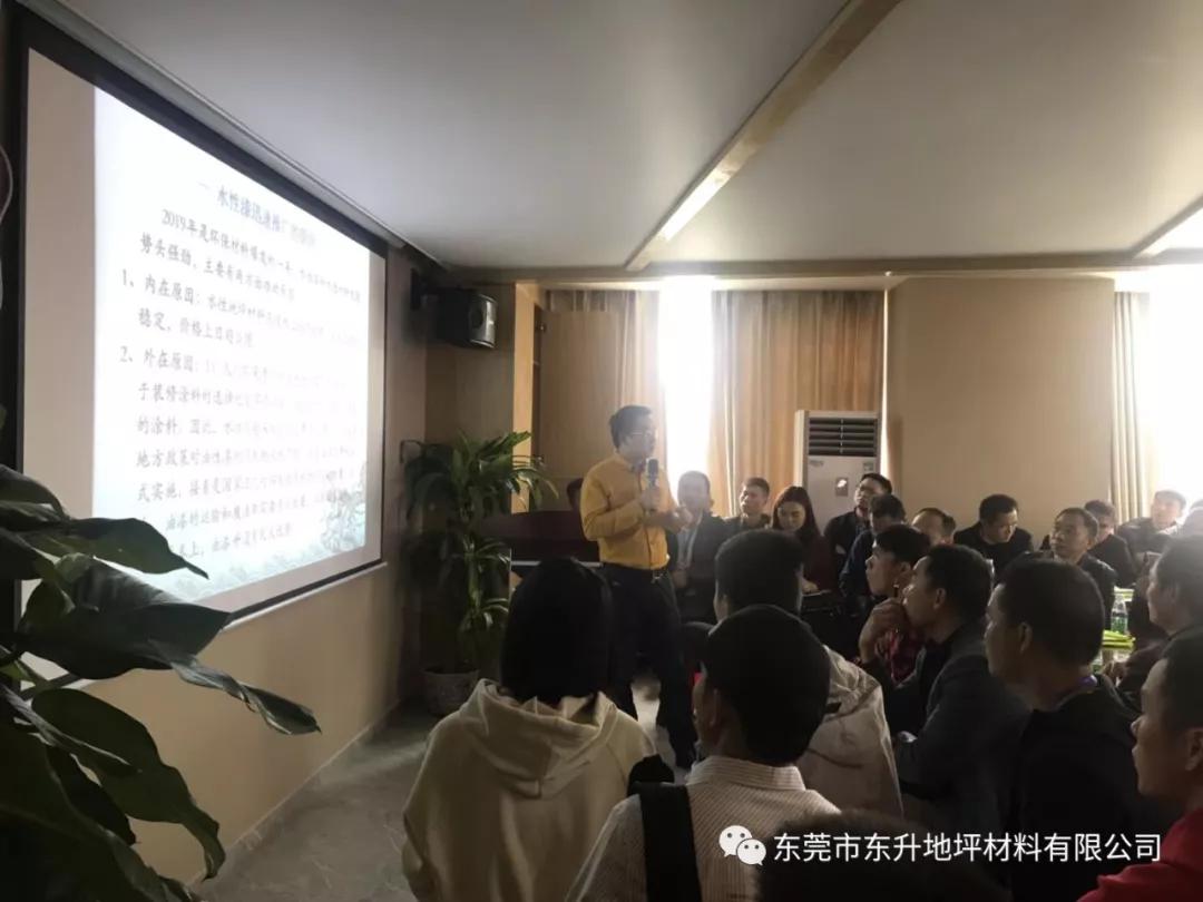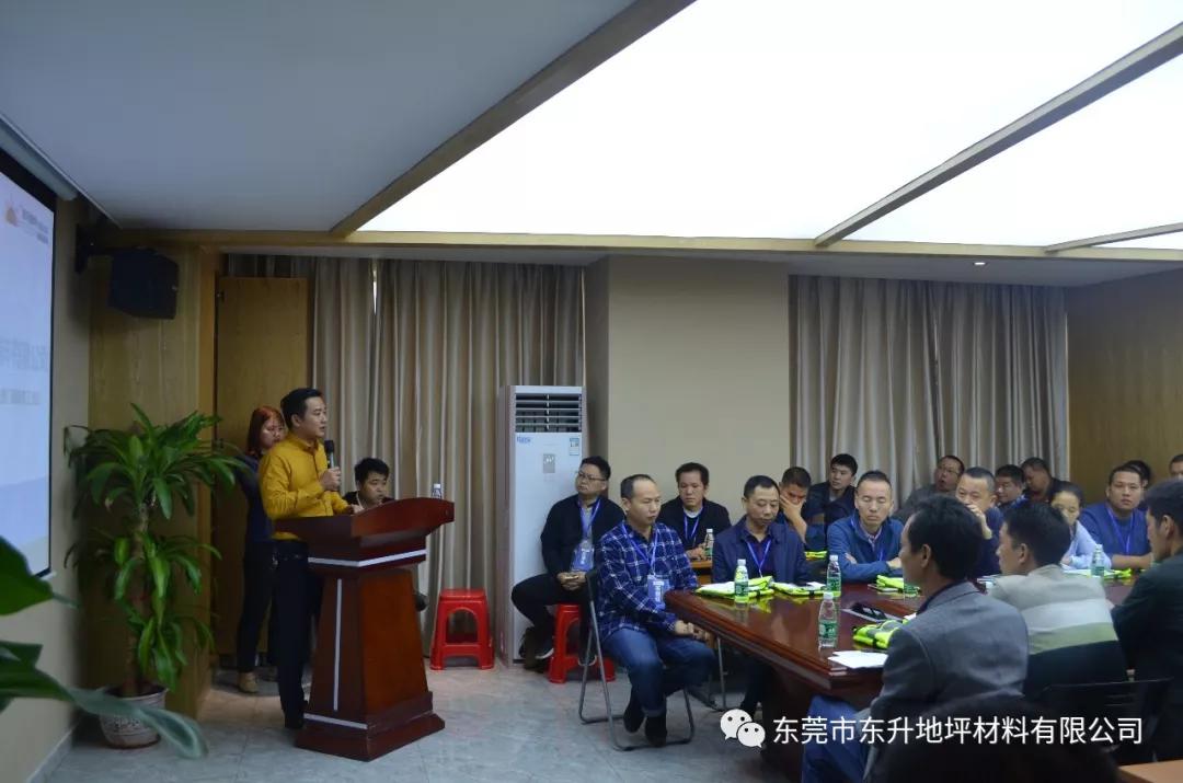 15日上午,由东升总部董事长-陈海波先生亲自讲解水性原材料及固化剂分析,详细讲解了地坪水漆的产品种类、水性地坪价格优势、水性工程应用实例 。