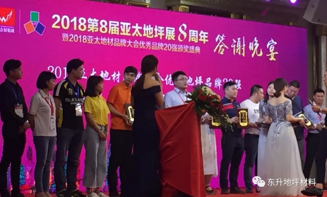 东莞市东升地坪材料有限公司,经2018第8届亚太地坪展组委会和网络投票评选出的2018亚太地材品牌大会优秀品牌20强,这也是东升连续六次问鼎此项殊荣,充分的体现了东升的品牌价值及专家客户对东升的的认可!