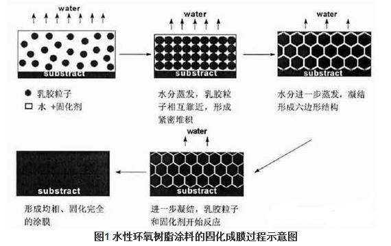 水性环氧树脂涂料是一种乳液涂料,其成膜机理与一般的聚合物乳液涂料如丙烯酸乳液的成膜有很大的区别,同时与溶剂型环氧树脂涂料的成膜也不完全相同。一般聚合物乳液涂料的固化成膜为一物理过程,分散相粒子的玻璃化温度较低,在水分挥发后就形成紧密堆积的结构,并在毛细管压力作用下凝结成膜。在溶剂型环氧树脂涂料体系中,环氧树脂和固化剂均以分子形式溶解在有机溶剂中,形成的体系是均相的,固化反应在分子之间进行,因而固化反应进行得比较完全,所形成的涂膜也是均相的。